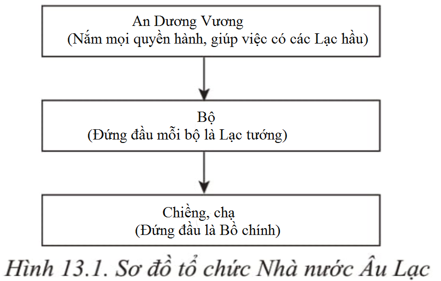 Đặt các từ ngữ cho sẵn vào các ô A, B, C để boàn thành sơ đồ tổ chức nhà nước Âu Lạc. Hãy chỉ ra những điểm giống và khác nhau giữa tổ chức Nhà nước Âu Lạc và tổ chức Nhà nước Văn Lang. (1) Bộ (Đứng đầu mỗi bộ là Lạc tướng): (2) Chiềng, chạ (Đứng đầu là Bồ chính), (3) An Dương Vương (Nắm mọi quyền hành, giúp việc có các Lạc hầu).