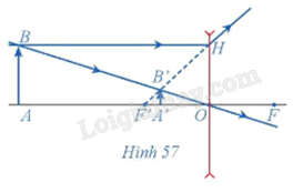 Một thấu kính phân kì có tiêu cự OF = OF’ = 20 cm (kính cận). Vật sáng AB được đặt vuông góc với trục chính của thấu kính, cách thấu kính một đoạn OA = 60 cm, qua thấu kính cho ảnh ảo A’B’ (Hình 57). A’B’ là ảnh của AB qua một phép vị tự tâm O tỉ số k.