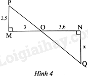 Tam giác PMO có PM//QN (cùng vuông góc với MN) nên theo hệ quả định lí Thalès ta có: \(\frac{{PM}}{{NQ}} = \frac{{MO}}{{ON}}\), suy ra \(\frac{{2,5}}{x} = \frac{3}{{3,6}}\), hay \(x = \frac{{2,5.3,6}}{3} = 3\)