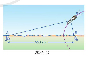 Dọc theo bờ biển, người ta thiết lập hệ thống định vị vô tuyến dẫn đường tầm xa để truyền tín hiệu cho máy bay hoặc tàu thủy hoạt động trên biển. Trong hệ thống đó có hai đài vô tuyến đặt lần lượt tại địa điểm A và địa điểm B, khoảng cách AB = 650 km (Hình 18). Giả sử có một con tàu chuyển động trên biển với quỹ đạo là hypebol nhận A và B là hai tiêu điểm.