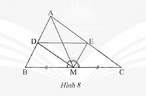 Cho tam giác \(ABC\) có đường trung tuyến \(AM\). Đường phân giác của góc \(AMB\) cắt \(AB\) tại \(D\) và đường phân giác góc \(AMC\) cắt \(AC\) tại \(E\) (Hình 8). Chứng minh \(DE//BC\).