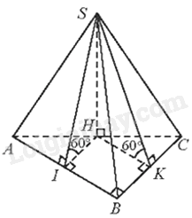 Khi đó, \(\left( {\left( {SAB} \right),\left( {ABC} \right)} \right) = \widehat {SIH} = {60^0}\), \(\left( {\left( {SBC} \right),\left( {ABC} \right)} \right) = \widehat {SKH} = {60^0}\)