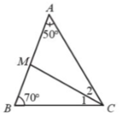 Cho tam giác ABC có  Tia phân giác của góc C cắt cạnh AB tại M. Tính số đo của \(\widehat {AMC}\) và \(\widehat {BMC}\)