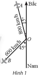 Hai máy bay rời một sân bay cùng một lúc. Một chiếc máy bay với vận tốc 800 km/h theo hướng lệch so với hướng bắc \(15^\circ \) về hướng tây. Chiếc còn lại bay theo hướng lệch so với hướng nam \(45^\circ \) về phía tây với vận tốc 600 km/h (hình 1). Hỏi hai máy bay đó cách nhau bao xa sau 3 giờ?