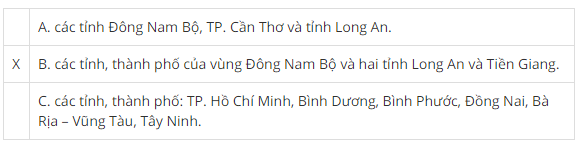 C. các tỉnh, thành phố: TP. Hồ Chí Minh, Bình Dương, Bình Phước, Đồng Nai, Bà Rịa – Vũng Tàu, Tây Ninh.