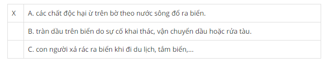 Giải bài 5 trang 97 vở bài tập Địa lí 9, Đánh dấu (X) vào ý đúng. Nguy cơ lớn nhất làm ô nhiễm môi trường biển đảo: A. các chất độc hại từ trên bờ theo nước sông đổ ra biển. B. tràn dầu trên biển do sự cố khai thác, vận chuyển dầu hoặc rửa tàu. C. con người xả rác ra biển khi đi du lịch, tắm biển,…