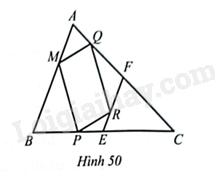 Cho tam giác \(ABC\) có \(E,F\) lần lượt là trung điểm của \(BC,AC\). Các điểm \(M,P,R,Q\) lần lượt nằm trên \(AB,BE,EF,FA\) sao cho \(\frac{{BM}}{{MA}} = \frac{{QF}}{{QA}} = \frac{{RF}}{{RE}} = \frac{{BP}}{{PE}} = 1,8\) (Hình 50).