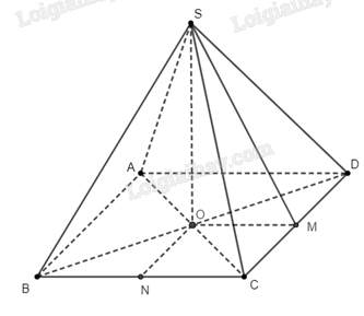 c) Gọi \(N\) là trung điểm của \(BC\). Tam giác \(OBC\) vuông cân tại \(O\), nên ta có \(ON \bot BC\). Hơn nữa, do \(SO \bot \left( {ABCD} \right)\), nên \(SO \bot ON\).