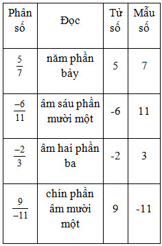 Với \(a,b \in \mathbb{Z},b \ne 0\), ta gọi \(\dfrac{a}{b}\) là phân số, trong đó a là tử số và b là mẫu số, đọc là a phần b.
