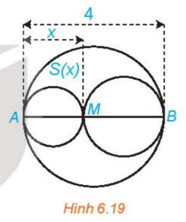 Xét đường tròn đường kính AB=4 và một điểm M di chuyển trên đoạn AB, đặt AM=x (H.6.19). Xét hai đường tròn đường kính AM và MB. Kí hiệu S(x) là diện tích phần hình phằng nằm trong hình tròn lớn và nằm ngoài hai hình tròn nhỏ.