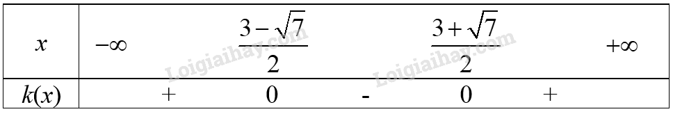 Suy ra k(x) > 0 với mọi \(x \in \left( { – \infty ;\frac{{3 – \sqrt 7 }}{2}} \right) \cup \left( {\frac{{3 + \sqrt 7 }}{2}; + \infty } \right)\) và k(x) < 0 với mọi \(x \in \left( {\frac{{3 – \sqrt 7 }}{2};\frac{{3 + \sqrt 7 }}{2}} \right)\)