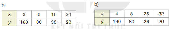 b) Ta có: 4.160 = 8. 80 = 320.20 \( \ne \)25.26 nên 2 đại lượng x, y không là hai đại lượng tỉ lệ nghịch.