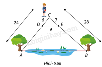 Bạn Cường đo được khoảng cách từ vị trí mình đứng (điểm C) đến cây A và  cây B ở hai bên hồ nước lần lượt là \(AC = 24m\) và \(BC = 28m\) (Hình 6.66). Để tính độ dài \(AB,\) Cường xác định điểm \(D\) nằm giữa \(A,C\) và điểm \(E\) nằm giữa \(B,C\) sao cho \(CD = 6m,CE = 7m\) và đo khoảng cách giữa \(D\) và \(E.\) Nếu \(DE = 9m\) thì khoảng cách giữa \(A\) và \(B\) là bao nhiêu mét?