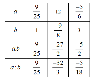 \(\begin{array}{l}a.b = \dfrac{{ – 5}}{6}.3 = \dfrac{{ – 5}}{2}\\a:b = \dfrac{{ – 5}}{6}:3 = \dfrac{{ – 5}}{6}.\dfrac{1}{3} = \dfrac{{ – 5}}{{18}}\end{array}\)