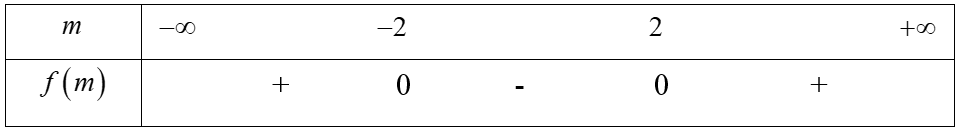 Ta có \(f\left( m \right) = {m^2} – 4\) có hai nghiệm phân biệt \({m_1} =  – 2\) và \({m_2} = 2.\)