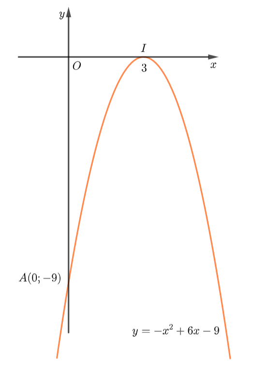 Đỉnh \(I\left( {3;0} \right).\) Trục đối xứng \(x = 3.\) Giao điểm của đồ thị với trục \(Oy\) là: \(A\left( {0; – 9} \right).\) Parabol cắt trục hoành tại \(x = 3.\)