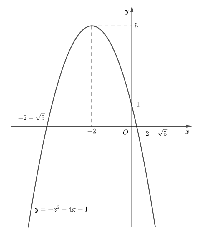 Đỉnh \(I\left( { – 2;5} \right).\) Trục đối xứng \(x =  – 2.\) Giao điểm của hàm số với trục \(Oy\) là: \(\left( {0;1} \right).\) Giao điểm của hàm số với trục \(Ox\) là: \(x =  – 2 + \sqrt 5 \) và \(x =  – 2 – \sqrt 5 .\)