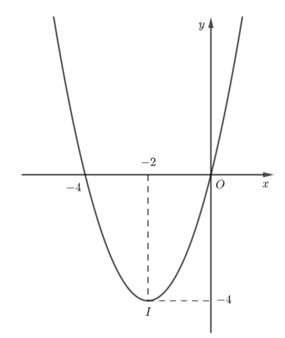 Đỉnh \(I\left( { – 2; – 4} \right).\) Trục đối xứng \(x =  – 2.\) Giao điểm của hàm số với trục \(Oy\) là: \(\left( {0;0} \right).\) Giao điểm của hàm số với trục \(Ox\) là: \(x = 0\) và \(x =  – 4.\)