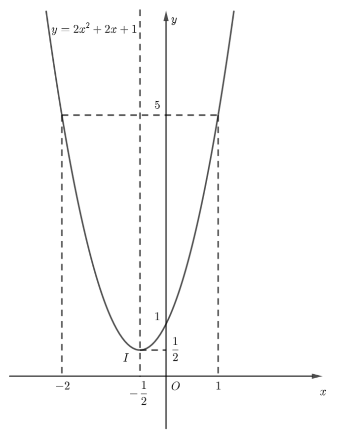 Đỉnh \(I\left( { – \frac{1}{2};\frac{1}{2}} \right).\) Trục đối xứng \(x =  – \frac{1}{2}.\) giao điểm của hàm số với trục \(Oy\) là: \(\left( {0;1} \right).\) Đồ thị hàm số không có giao điểm với trục \(Ox.\) Lấy điểm \(\left( {1;5} \right)\) thuộc đồ thị hàm số, điểm đối xứng với điểm đó qua trục đối xứng \(x =  – \frac{1}{2}\) là: \(\left( { – 2;5} \right).\)