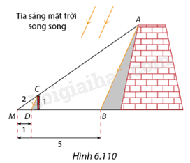 Vào một thời điểm trong ngày, \(B\) và \(D\) lần lượt là các bóng của điểm \(A\) trên mặt thành cổ và điểm \(C\) trên đỉnh cột lên mặt đất, các điểm \(M,C,A\) thẳng hàng và các điểm \(M,D,B\) thẳng hàng (Hình 6.110). Người ta đo được các khoảng cách \(MD = 1m,MB = 5m\) và \(MC = 2m.\)