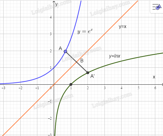 Gọi \(A’\) là điểm đối xứng của \(A\) qua đường thằng \(y = x\). Ta tìm được \(A’\left( {{e^{{x_0}}};{x_0}} \right)\). Khi đó \(A’\) thuộc đồ thị hàm số \(y = {\rm{ln}}x\). Tương tự nếu điếm \(B\left( {{x_0}{\rm{;ln}}{x_0}} \right)\) nằm trền đồ thị hàm số \(y = {\rm{ln}}x\) thì ta cũng có thể tìm toạ độ của điềm \(B’\) đối xứng với \(B\) qua đường thẳng \(y = x\) và chứng minh \(B’\) thuộc đồ thị hàm số \(y = {e^x}\).