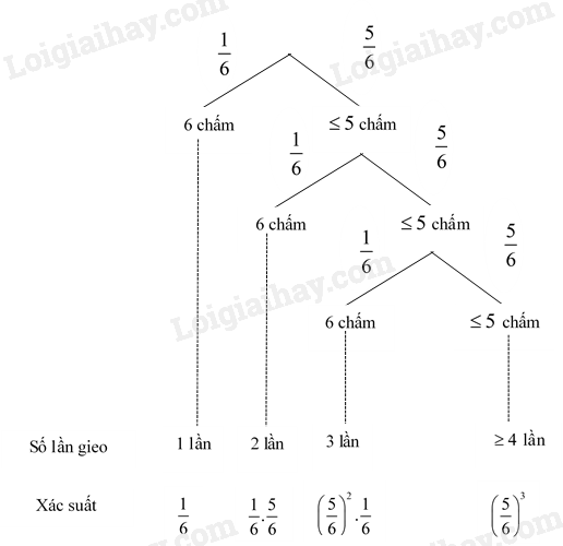 Châu gieo một con xúc xắc cân đối và đồng chất liên tiếp cho đến khi xuất hiện mặt 6 chấm thì dừng lại. Sử dụng sơ đồ hình cây, tính xác suất của biến cố “Châu phải gieo không quá ba lần để xuất hiện mặt 6 chấm”.