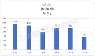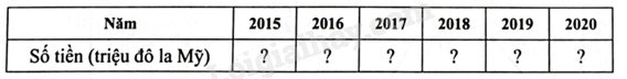 b)    Hãy hoàn thiện biểu đồ ở Hình 20 để nhận được biểu đồ cột biểu diễn các số liệu thống kê kim ngạch xuất khẩu cá tra Việt Nam vào thị trường EU ở các năm 2015, 2016, 2017, 2018, 2019, 2020.