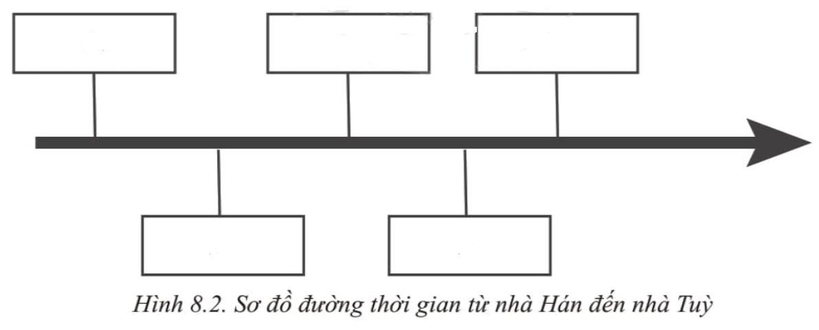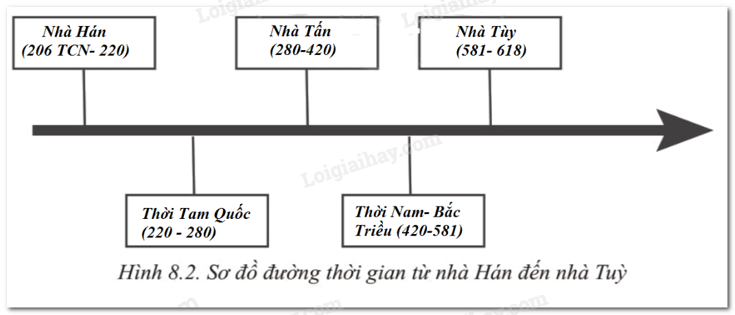 Hãy đặt các từ ngữ cho sẵn vào các ô A, B, C, D, E để hoàn thành sơ để đường thời gian từ nhà Hán đến nhà Tùy : (I) Nhà Tần (280 – 420), (2) Nhà Hán (206 TCN – 220); (3) Thời Nam – Bắc triều (420 ~ 581); (4) Nhà Tuỷ (581 — 618); (5) Thời Tam Quốc (220 – 280).