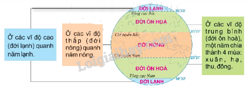 Ở các vĩ độ cao (đới lạnh) hầu như (1) quanh năm lạnh Ở các (2) vĩ độ thấp (đới nóng) hầu như quanh năm nóng. Ở các vĩ độ trung bình ((3) đới ôn hòa) một năm (4) chia thành bốn mùa xuân, hạ, thu, đông.