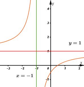 Tiệm cận đứng là \(\displaystyle x=-1\), tiệm cận ngang là: \(\displaystyle y=1\)