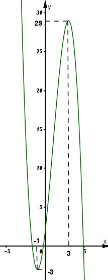 Hàm số đạt cực đại tại \(x=3\); \(y_{CĐ}=29\)