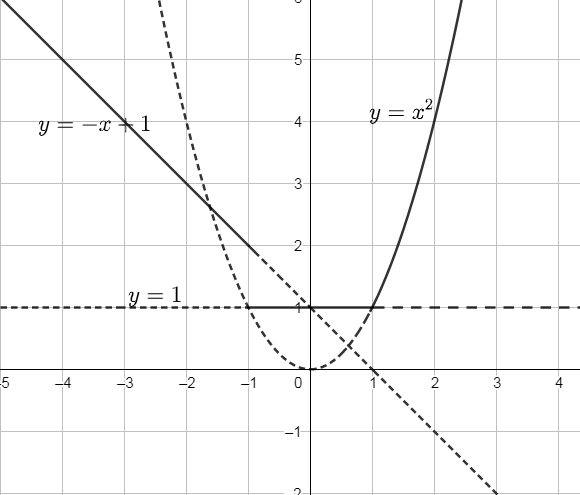 Ta vẽ đồ thị hàm số \(g\left( x \right) =  – x + 1\) và giữ lại phần đồ thị ứng với \(x <  – 1\), vẽ đồ thị hàm số \(h\left( x \right) = 1\) và giữ lại phần đồ thị ứng với \( – 1 \le x < 1\), và cuối cùng ta vẽ đồ thị hàm số \(p\left( x \right) = {x^2}\) giữ lại phần đồ thị ứng với \(x \ge 1\). Ta được đồ thị cần vẽ như sau