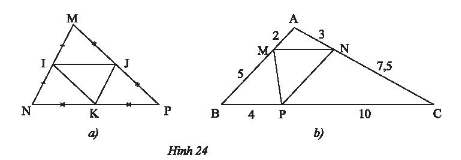 \(\frac{{NK}}{{NP}} = \frac{1}{2};\frac{{IN}}{{MN}} = \frac{1}{2} \Rightarrow \frac{{NK}}{{NP}} = \frac{{IN}}{{MN}} \Rightarrow IK//MP\) (Định lí Thales đảo).