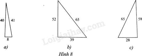 Vì \({65^2} \ne {28^2} + {58^2}\) nên tam giác trong hình 8c không phải là tam giác vuông.