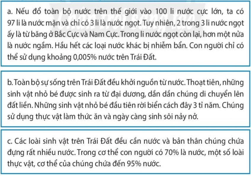 Em hãy đọc thông tin trong các ô dưới đây và xem hình 16.5 để trả lời các câu hỏi sau: Hãy chứng minh tầm quan trọng của nước. Giải thích vì sao cần phải bảo vệ và sử dụng tiết kiệm nguồn nước ngọt?