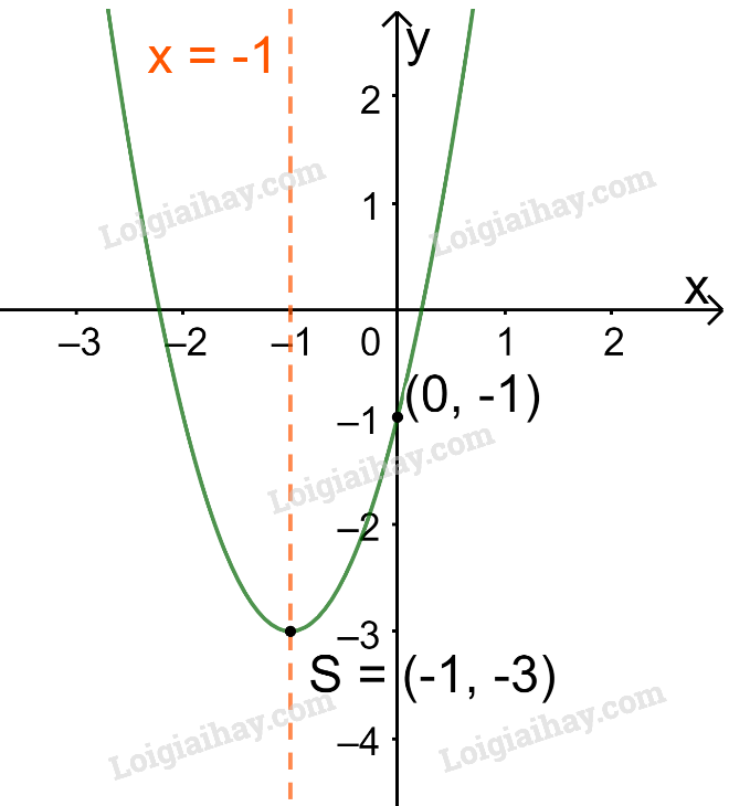 + Có đỉnh S với hoành độ: \({x_S} = \frac{{ – b}}{{2a}} = \frac{{ – 4}}{{2.2}} =  – 1;{y_S} = 2.{( – 1)^2} + 4.( – 1) – 1 =  – 3.\)