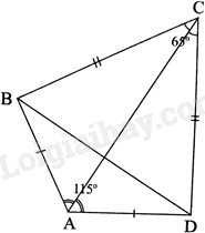 Cho tứ giác ABCD có \(AB = AD,CB = CD,\widehat C = {65^0},\widehat A = {115^0}\)