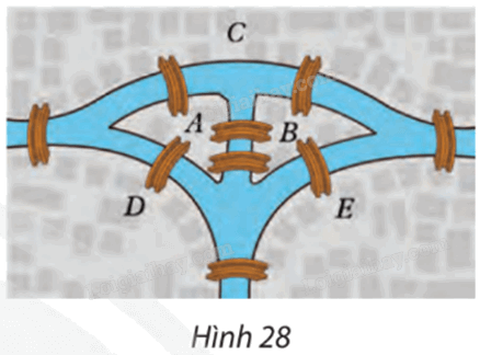 Có năm vùng đất A, B, C, D và E được nối với nhau bằng những cây cầu như Hình 28.
