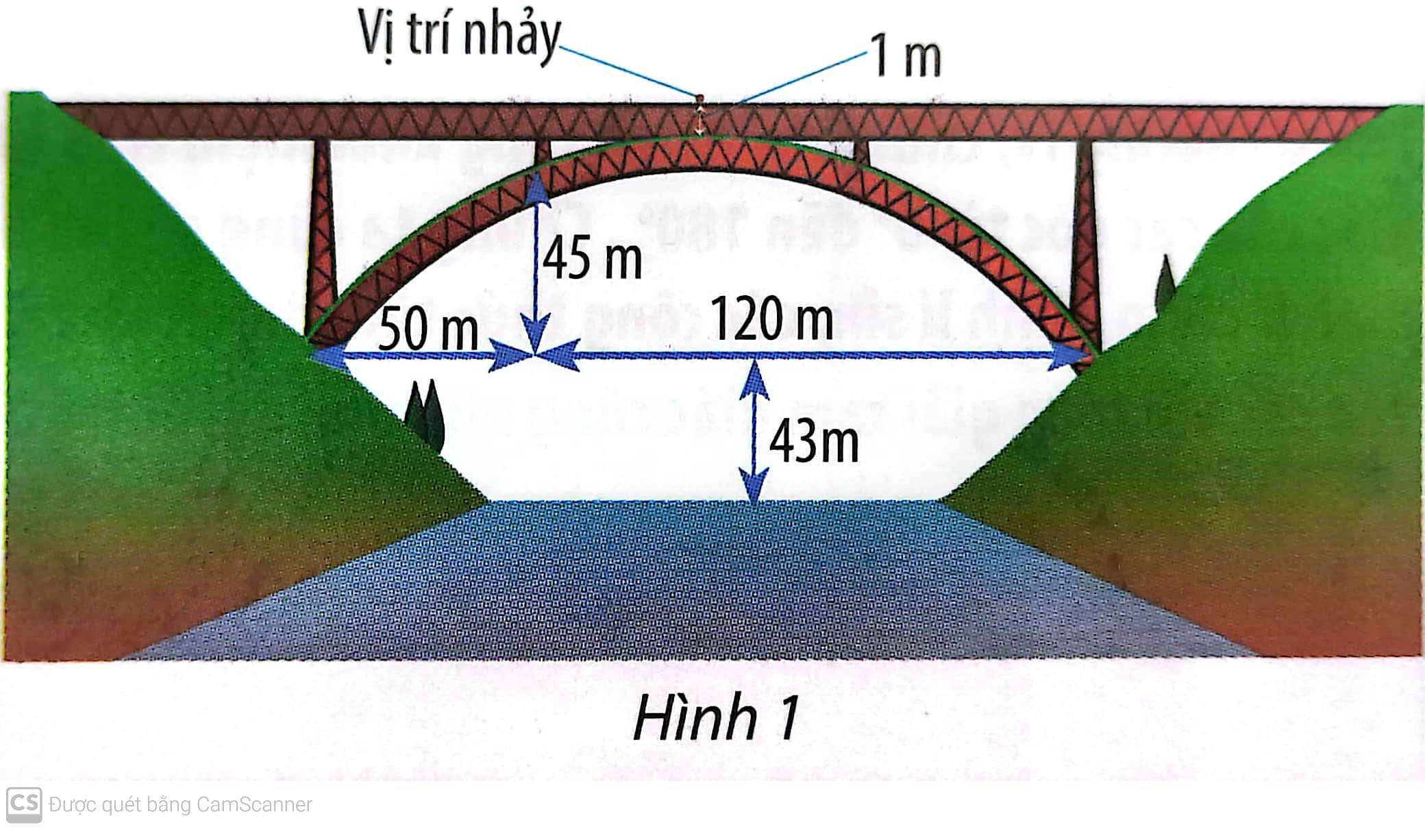 Nhảy bungee là một trò chơi mạo hiểm. Trong trò chơi này, người chơi đứng ở vị trí trên cao, thắt dây an toàn và nhảy xuống. Sợi dây này có tính đàn hồi và được tính toán chiều dài để nó kéo người chơi lại khi gần chạm đất (hoặc mặt nước). Chiếc cầu trong Hình 1 có bộ phận chống đỡ dạng parabol. Một người muốn thực hiện một cú nhày bungee từ giữa cầu xuống với dây an toàn. Người này cần trang bị sợi dây an toàn dài bao nhiêu mét? Biết rằng chiều dài của sợi dây đó bằng một phần ba khoảng cách từ vị trí bắt đầu nhảy đến mặt nước.