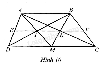 Trong Hình 10, cho biết \(ABCD\) là hình thang, \(AB//CD\left( {AB < CD} \right)\); \(M\) là trung điểm của \(DC\); \(AM\) cắt \(BD\) ở \(I\); \(BM\) cắt \(AC\) ở \(K\); \(IK\) cắt \(AD,BC\) lần lượt ở \(E,F\). Chứng minh: