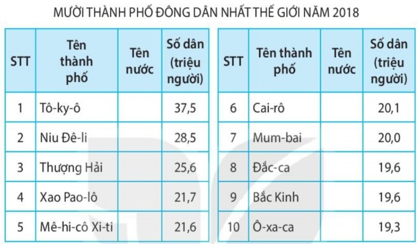 a) Ghi tên các nước vào bảng sau theo mẫu sao cho phù hợp. b) Xác định tên của năm thành phố đông dân trên thế giới năm 2018 trong lược đồ sau: