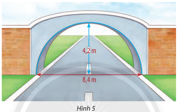 Gắn trục tọa độ tại tim đường, ta có phương trình mô phỏng cái cổng là : \({x^2} + {y^2} = 4,{2^2}\) (với điều kiện \(y > 0\) vì cổng luôn nằm trên mặt đường)