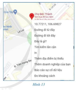 Nhập địa điểm “chợ Bến Thành” trên trang http://google.com/maps, sau đó nháy chuột phải vào địa điểm đó trên bản đồ ta được thông tin về kinh độ, vĩ độ như hình 13. Hãy viết tọa độ địa lí của chợ bến thành thuộc thành phố Hồ Chí Minh. Hãy viết tọa độ địa lí của chợ Bến Thành thuộc thành phố Hồ chí Minh.