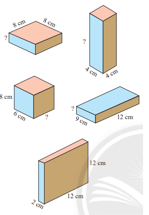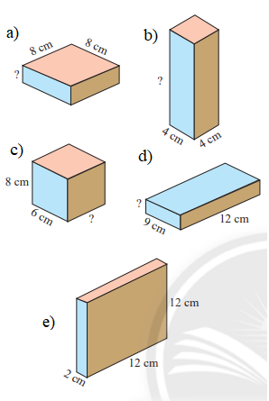 Các hình hộp chữ nhật trong Hình 5 có cùng số đo thể tích. Em hãy tìm các kích thước còn thiếu.