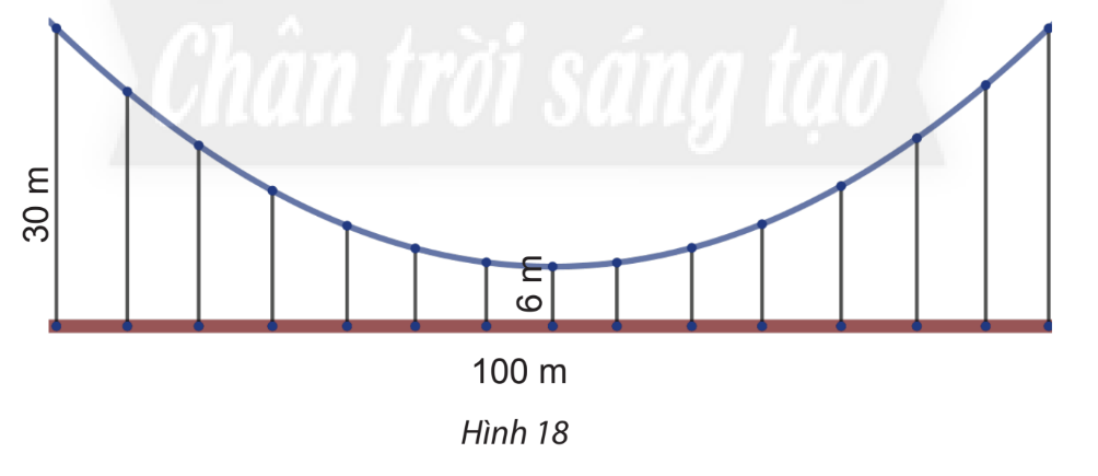Một cái cầu có dây cáp treo như hình vẽ parabol, cầu dài 100 m và được nâng đỡ bởi những thanh thẳng đứng treo từ cáp xuống, thanh dài nhất là 30m, thanh ngắn nhất là 6m (hình 18). Tính chiều dài của thanh cách điểm giữa cầu 18m