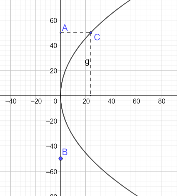 Thay tọa độ C vào phương trình \({y^2} = 2px\) ta có \(2500 = 2p.24 \Rightarrow p = \frac{{625}}{{12}}\)