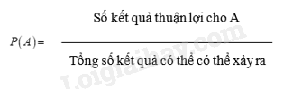 Sử dụng kiến thức về xác suất của biến cố để tính: Khi tất cả các kết quả của một trò chơi hay một phép thử đều có khả năng xảy ra bằng nhau thì xác suất của biến cố A là tỉ số giữa số kết quả thuận lợi cho A và tổng số kết quả có thể xảy ra của phép thử, tức là: