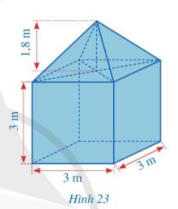 Hình 23 mô tả một lều trại gồm hai phần: phần dưới có dạng hình lập phương với cạnh là 3 m; phần trên có dạng hình chóp tứ giác đều với chiều cao là 1, 8m. Tính thể tích của lều trại đó.