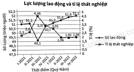 a) Đường gấp khúc nét liền biểu diễn số lượng người lao động (đơn vị là triệu người) từ quý I năm 2021 đến quý IV năm 2022, đường gấp khúc nét đứt biểu diễn tỉ lệ thất nghiệp (%) trong giai đoạn này.