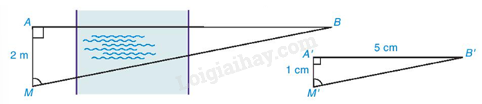 Một người ở vị trí điểm A muốn đo khoảng cách đến điểm B ở bên kia sông mà không thể qua sông được. Sử dụng giác kế, người đó xác định được một điểm M trên bờ sông sao cho AM = 2m, AM vuông góc với AB và đo được số đo góc AMB. Tiếp theo, người đó vẽ trên giấy tam giác A’M’B’ vuông tại A, có A’M’ – 1cm, $\widehat{A’M’B’}=\widehat{AMB}$ và đo được A’B’ = 5cm. (H.9.15). Hỏi khoảng cách từ A đến B là bao nhiêu mét?